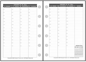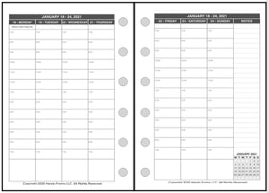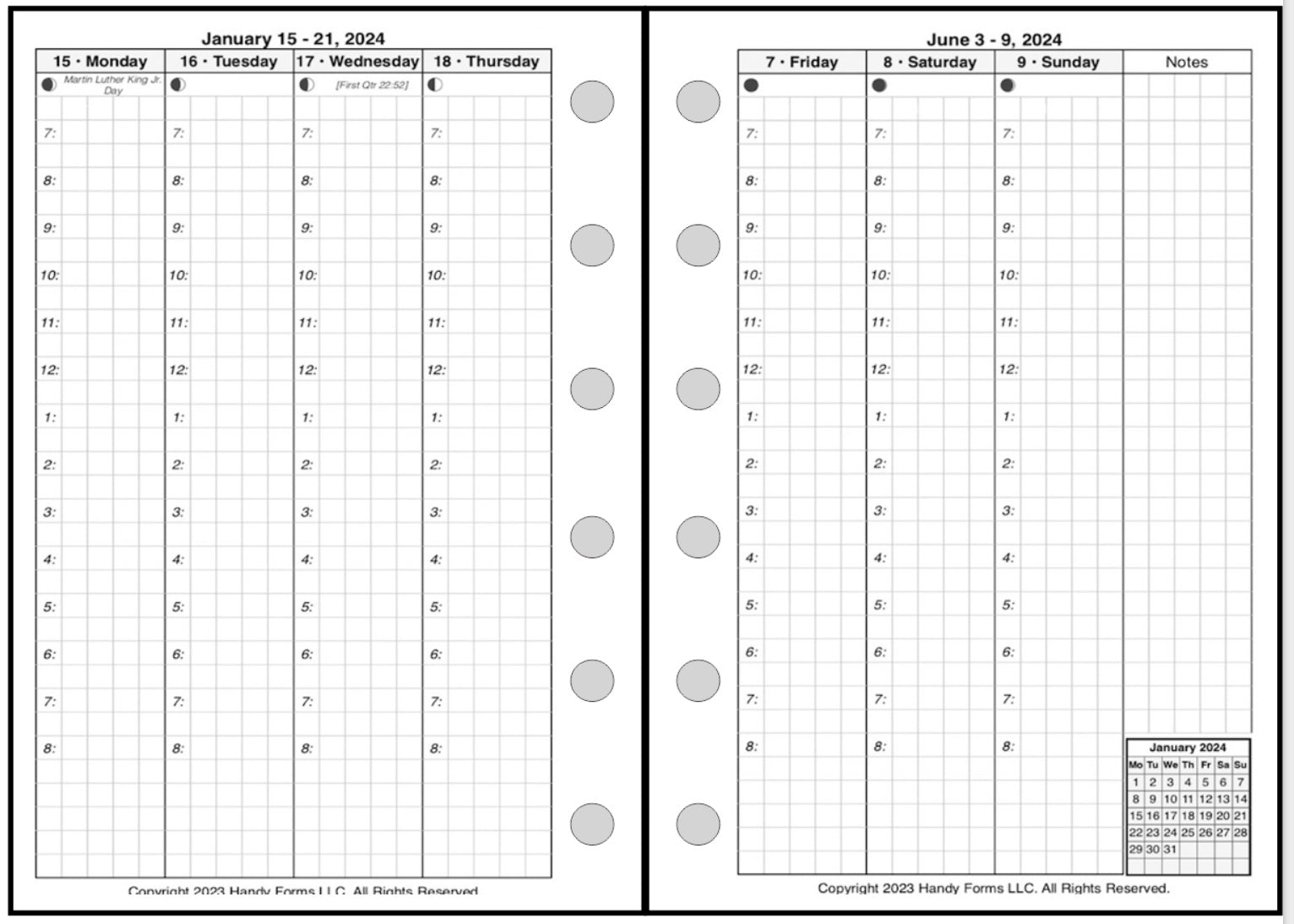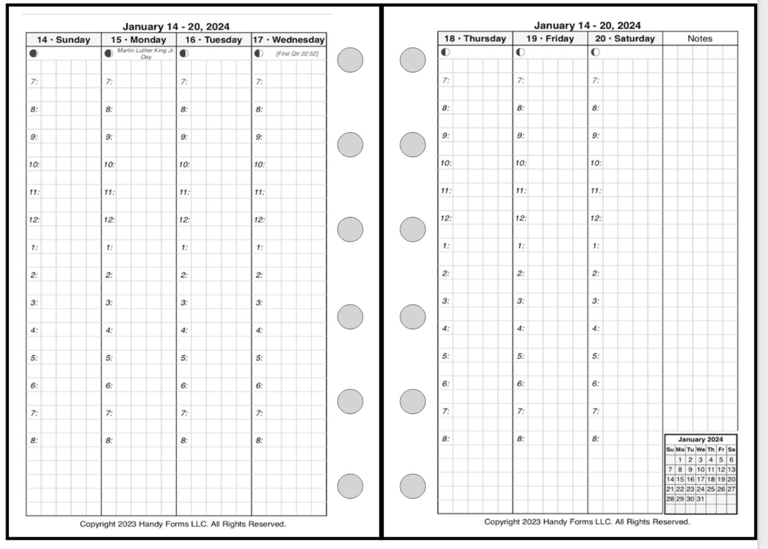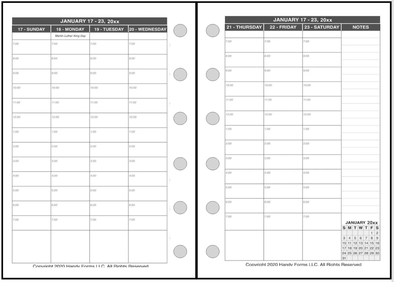 This is a weekly & monthly planner insert for Pocket Plus size notebooks. Page is Pocket Plus size, 3½" x 5". Choose the week start day as Sunday or Monday. Each day of the week is a vertical column. The first 4 days of the week are on the left, and the last 3 are on the right. The right-hand column is lined for notes. Time slots are printed for 7:00 AM through 7:00 PM on each day. There is a mini reference calendar for the current month at the bottom of the notes column.