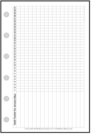 This is a monthly planner and habit tracker insert for Pocket Plus size notebooks. Page is Pocket Plus size, 3½" x 5". The week starts with Sunday or Monday. Each month is a 4 pages. The first page is the habit list and daily tracking for the month. Following this page is the 2-page calendar spread for the month with days arranged according to the monthly style (see below). The 4th page is labeled "Month Review and Habit Notes". For 6-column and 8-column styles, if the 30th and/or the 31st would fall below the bottom row of the monthly spread, these dates are moved to the first 2 daily blocks in the first row. There are no lines in the daily blocks.