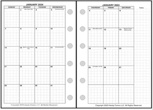 This is a monthly planner insert for Pocket-Plus size notebooks. Page size is Pocket-Plus, 3½" x 5" (89mm x 127mm). The week start is optionally Sunday or Monday. Each month is a 2-page spread. The first 4 days of the week are on the left-hand page, and the last 3 days are on the right, plus an area for notes. Lines are printed in the daily blocks. This is a 5 week monthly layout, so occasionally the 30th and/or the 31st would fall below the bottom row. When this happens, these dates can be either moved to the first 2 daily blocks in the first row, or these overflow days can share the first 2 blocks of the 5th week.