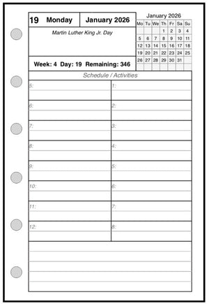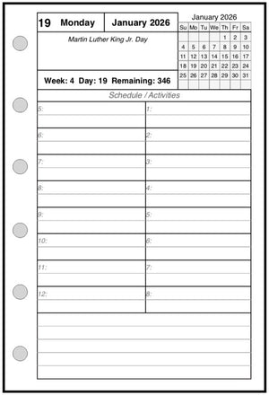 This is a daily and monthly planner insert for the Pocket Plus size notebooks. Page size is Pocket Plus 3½" x 5" (89mm x 127mm). Choose the week starting day as Sunday or Monday. Each day is on one page. The hourly appointment blocks are arranged vertically in 2 columns with times from 6:00 am through 7:00 pm. The appointment time range can be changed through customization.