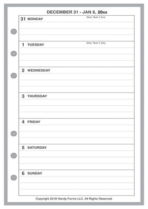 This is a weekly and monthly planner insert for the Personal Wide notebook. Page is Personal Wide size, 4-3/4in x 6-3/4in. Choose the week start day as Sunday or Monday. Each week is on one page, and months are 2-page spreads. The weekly pages have separate blocks for each day.