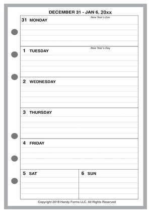 This is a weekly and monthly planner insert for the Personal Wide notebook. Page is Personal Wide size, 4-3/4in x 6-3/4in. The week starts on Monday. Each week is on one page. The weekly page includes full sized blocks for Monday through Friday, with half size blocks for Saturday and Sunday at the bottom. Also included are 1-page yearly calendars for the current year and next year.