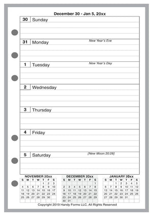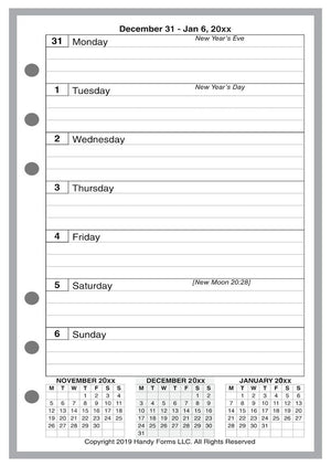 This is a weekly and monthly planner insert for the Personal Wide notebook. Page is Personal Wide size, 4-3/4in x 6-3/4in. Choose the week start day as Sunday or Monday. Each week is on one page, with separate blocks for each day. There are 4 lines for writing in each daily block. There are 3 mini-reference calendars across the bottom of each page for the previous, current, and following month.