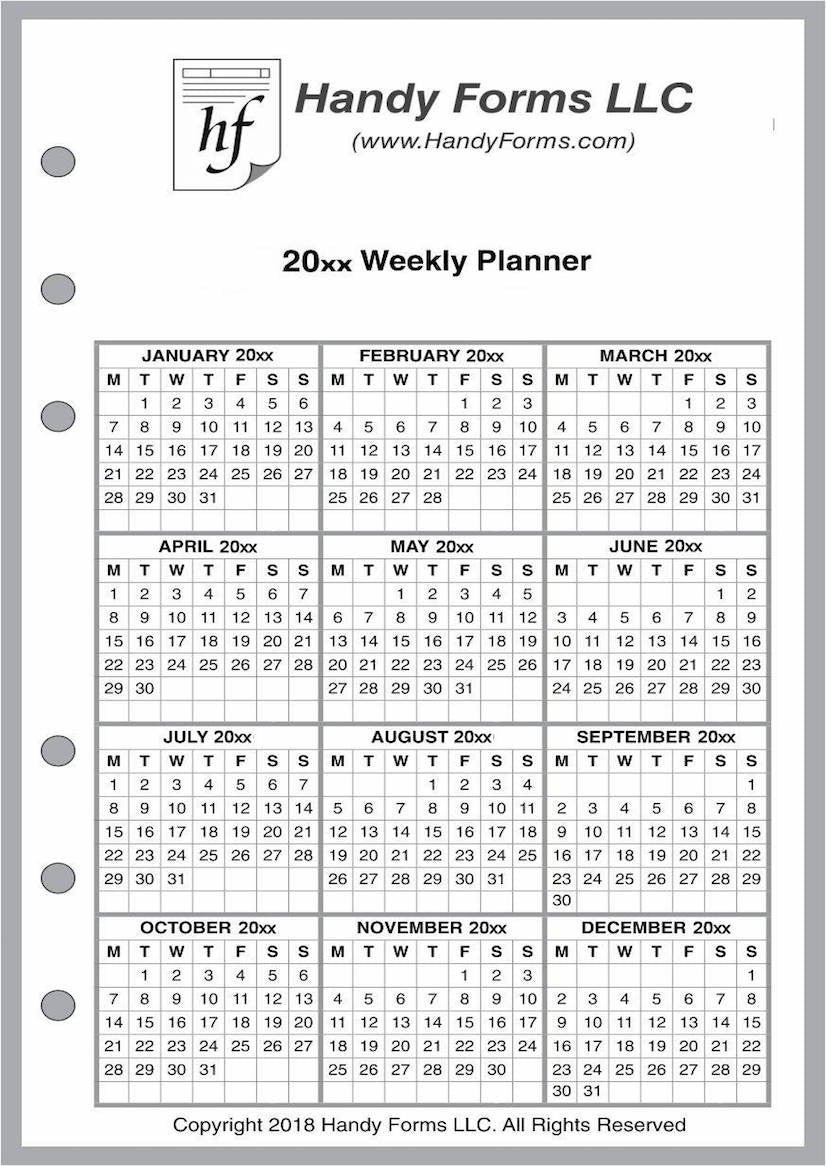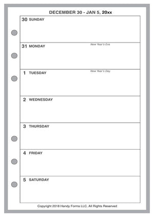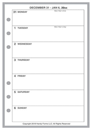 This is a weekly and monthly planner insert for the Personal Wide notebook. Page is Personal Wide size, 4-3/4in x 6-3/4in. Choose the week start day as Sunday or Monday. Each week is on one page, and months are 2-page spreads. The weekly pages have separate blocks for each day.