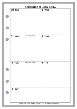 This is a weekly and monthly planner insert for the Personal Wide notebook. Page is Personal Wide size, 4-3/4in x 6-3/4in. Choose the week start day as Sunday or Monday. Each week is on one page. The daily blocks are arranged vertically with the first 3 days of the week on the left, the next 3 on the right, with the last day across the bottom.