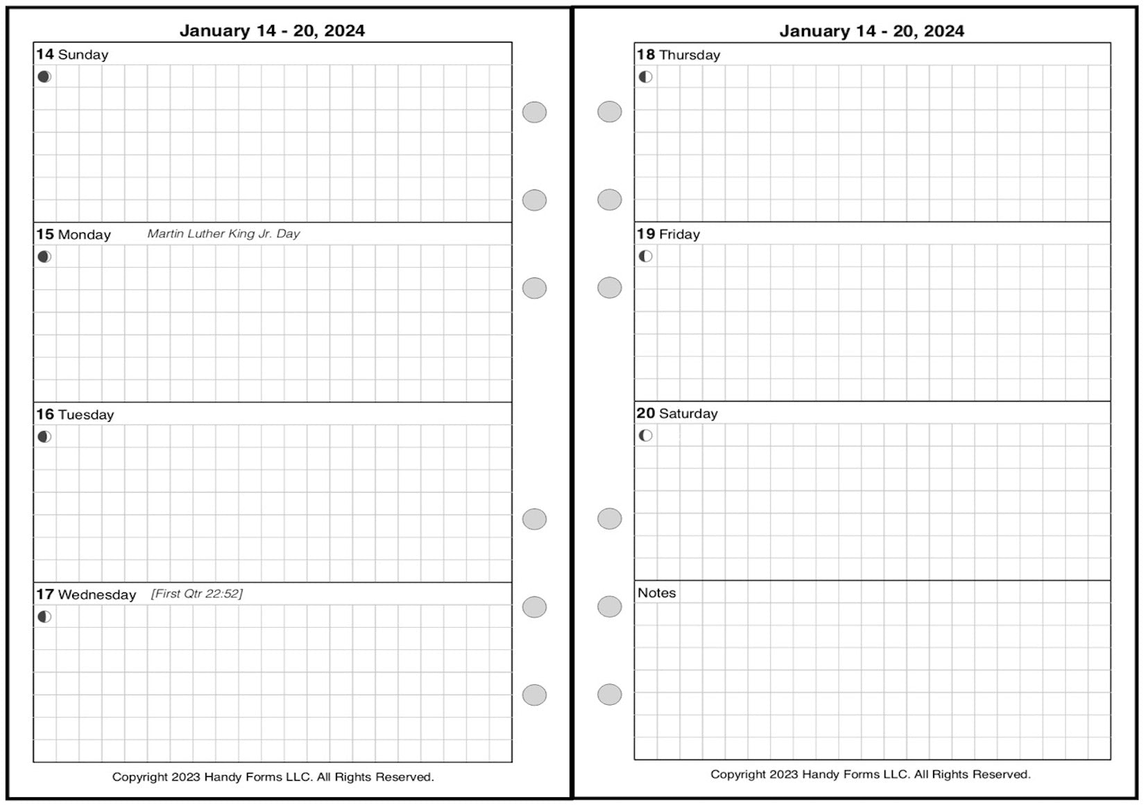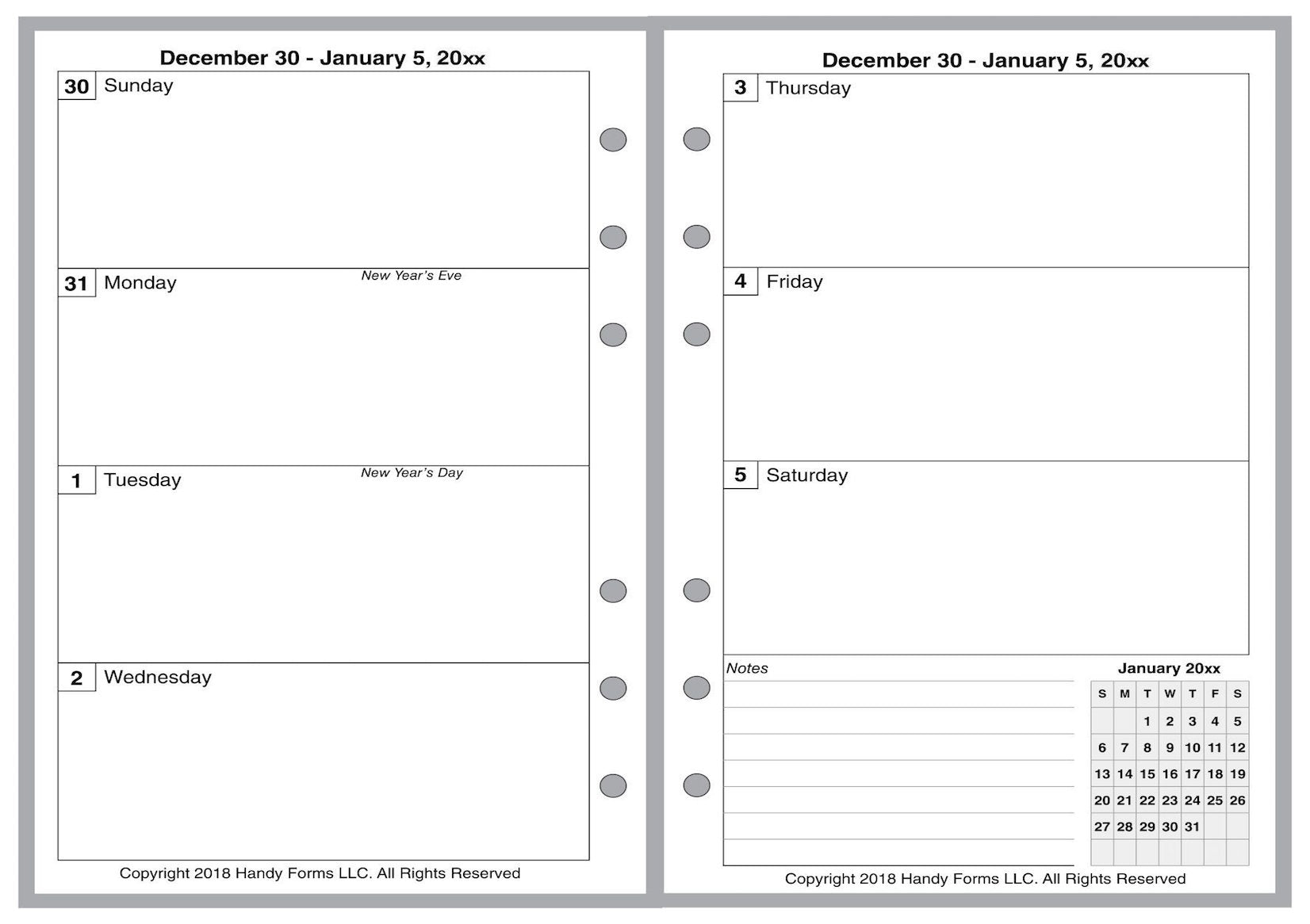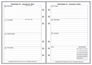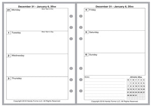 This is a weekly & monthly planner insert for the Personal Wide notebook. Page is Personal Wide size, 4-3/4in x 6-3/4in. Each week is on 2 pages. Choose the week start day as Sunday or Monday. The first 4 days of the week are on the left, and the last 3 are on the right, plus space for notes and a mini reference calendar of the current month.