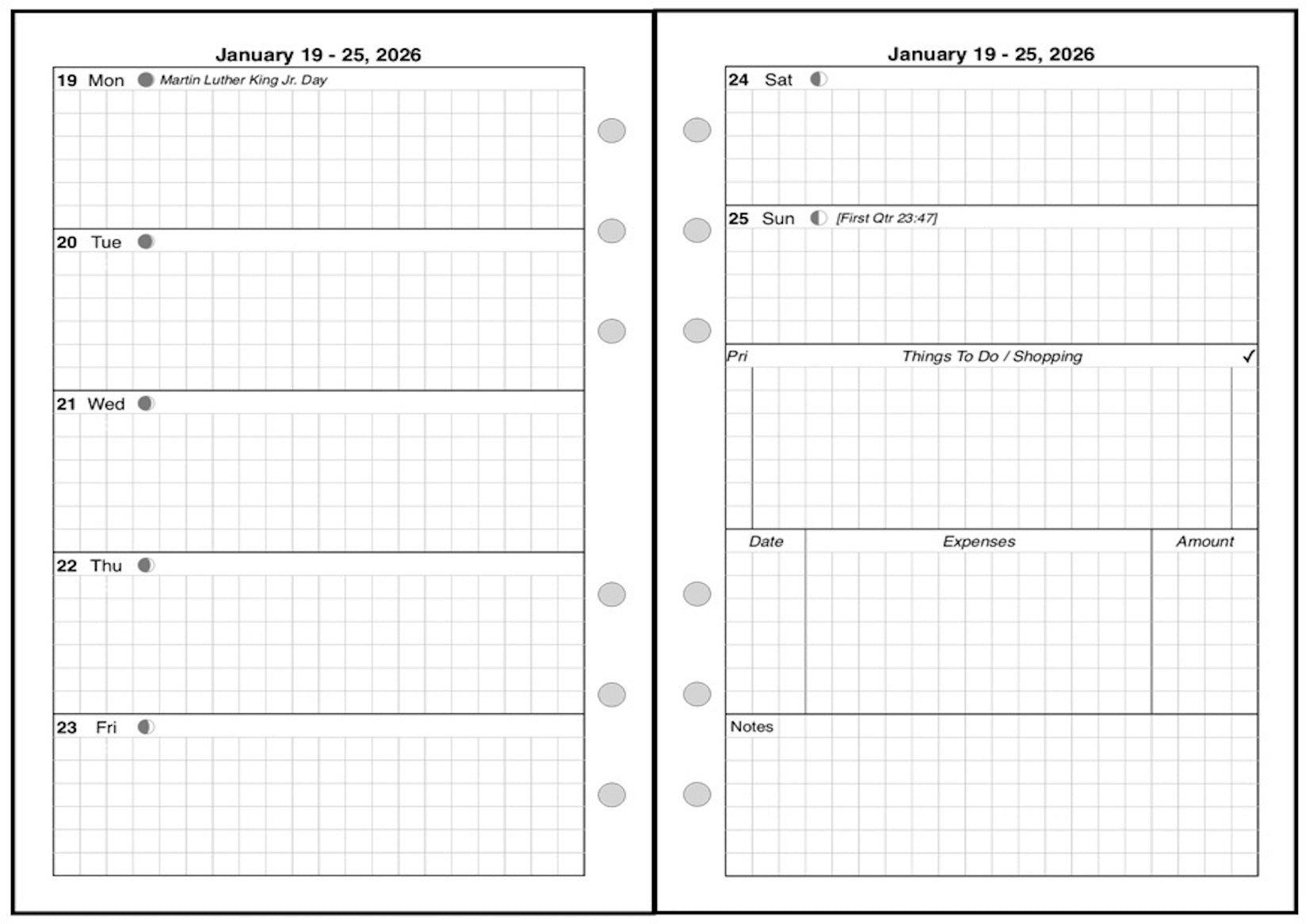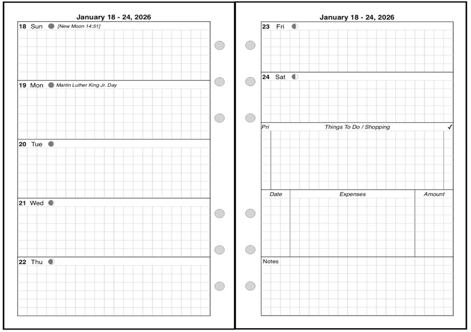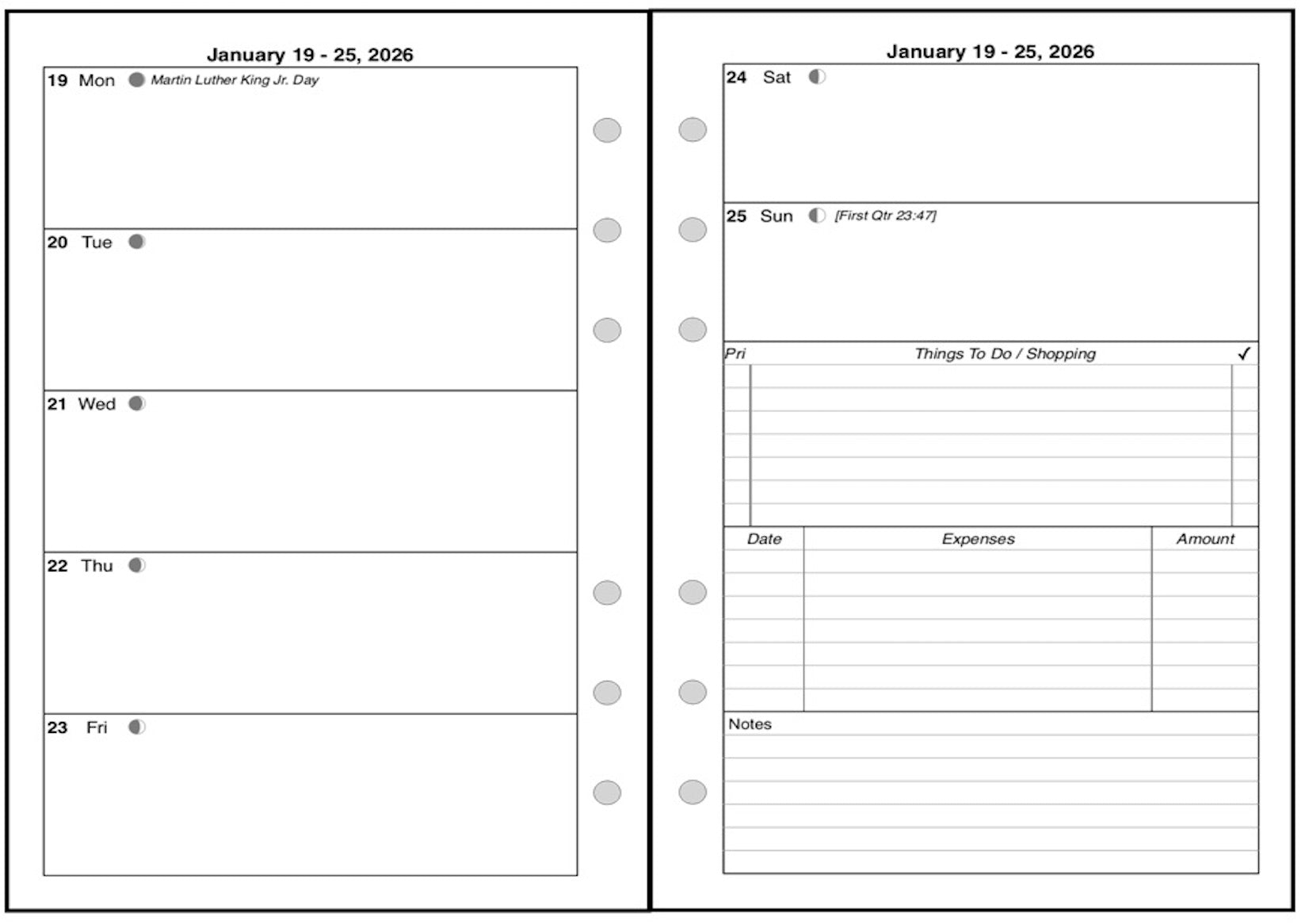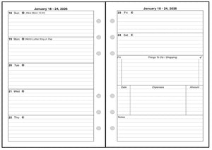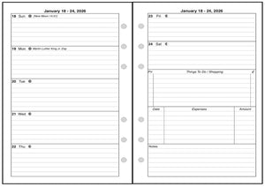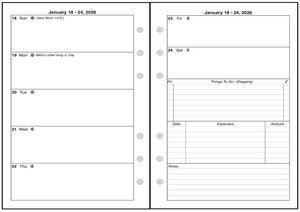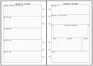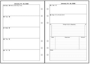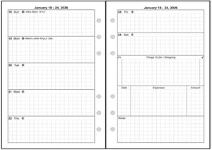This is a weekly & monthly planner insert for the Personal Wide notebook. Page is Personal Wide size, 4-3/4in x 6-3/4in. Choose the week start day as Sunday or Monday. Each week is a 2-page spread. The first 5 days of the week on the left, the last 2 on the right. On the right there are sections for a weekly To-Do list, an expense record, and notes.