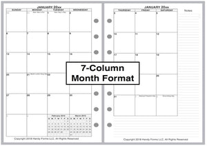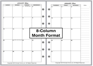 If selected, the monthly spreads are merged with the weekly pages so that the month appears immediately before the weekly pages where the first day of that month occurs. A durable plastic tab is attached to the weekly page just before the month. The monthly pages are available in 3 different formats called 6-column, 7-column, and 8-column. Please see the images for examples.