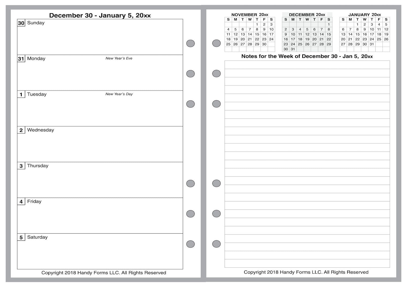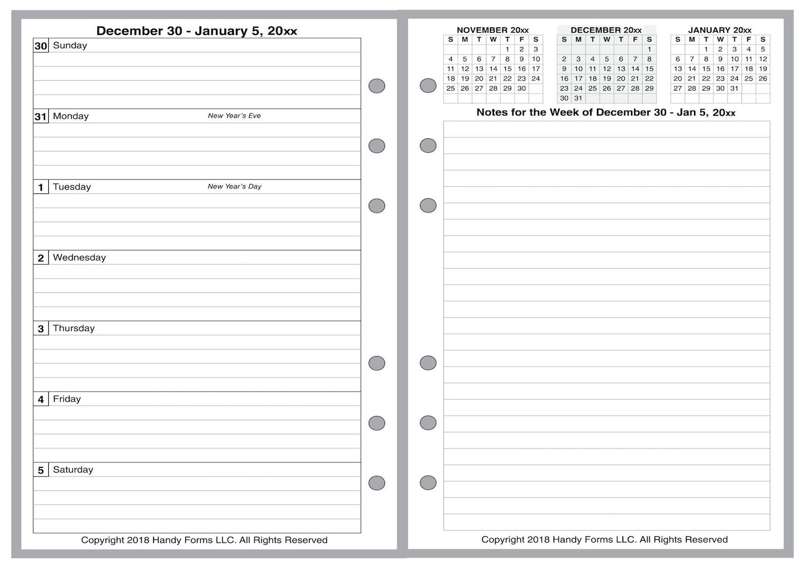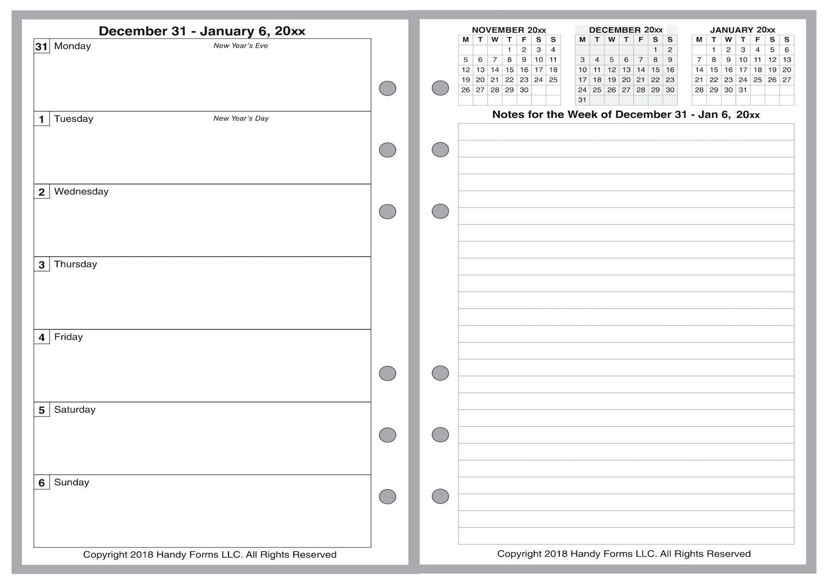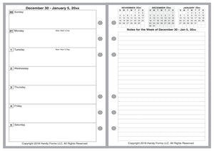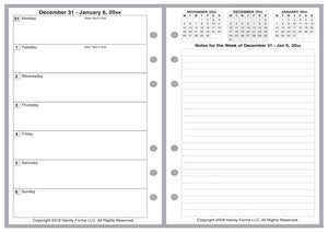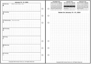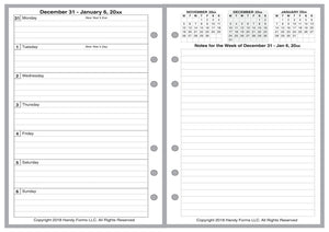 This is a weekly & monthly planner insert for the Personal Wide notebook. Page is Personal Wide size, 4-3/4in x 6-3/4in. Choose the week start day as Sunday or Monday. Each week is a 2-page spread. The days of the week are on the left. On the right is a note page which includes mini-reference monthly calendars showing the previous, current, and following months.