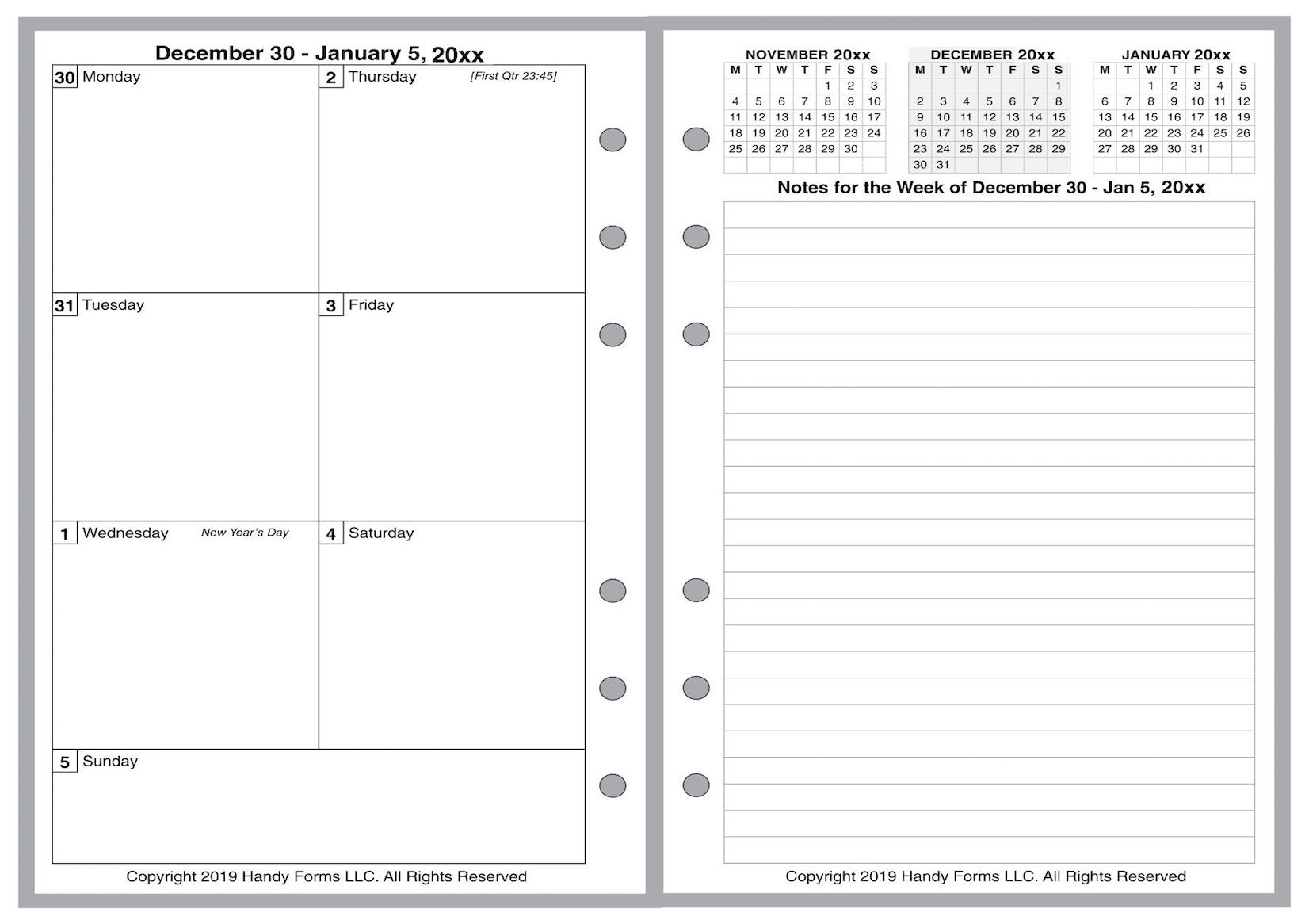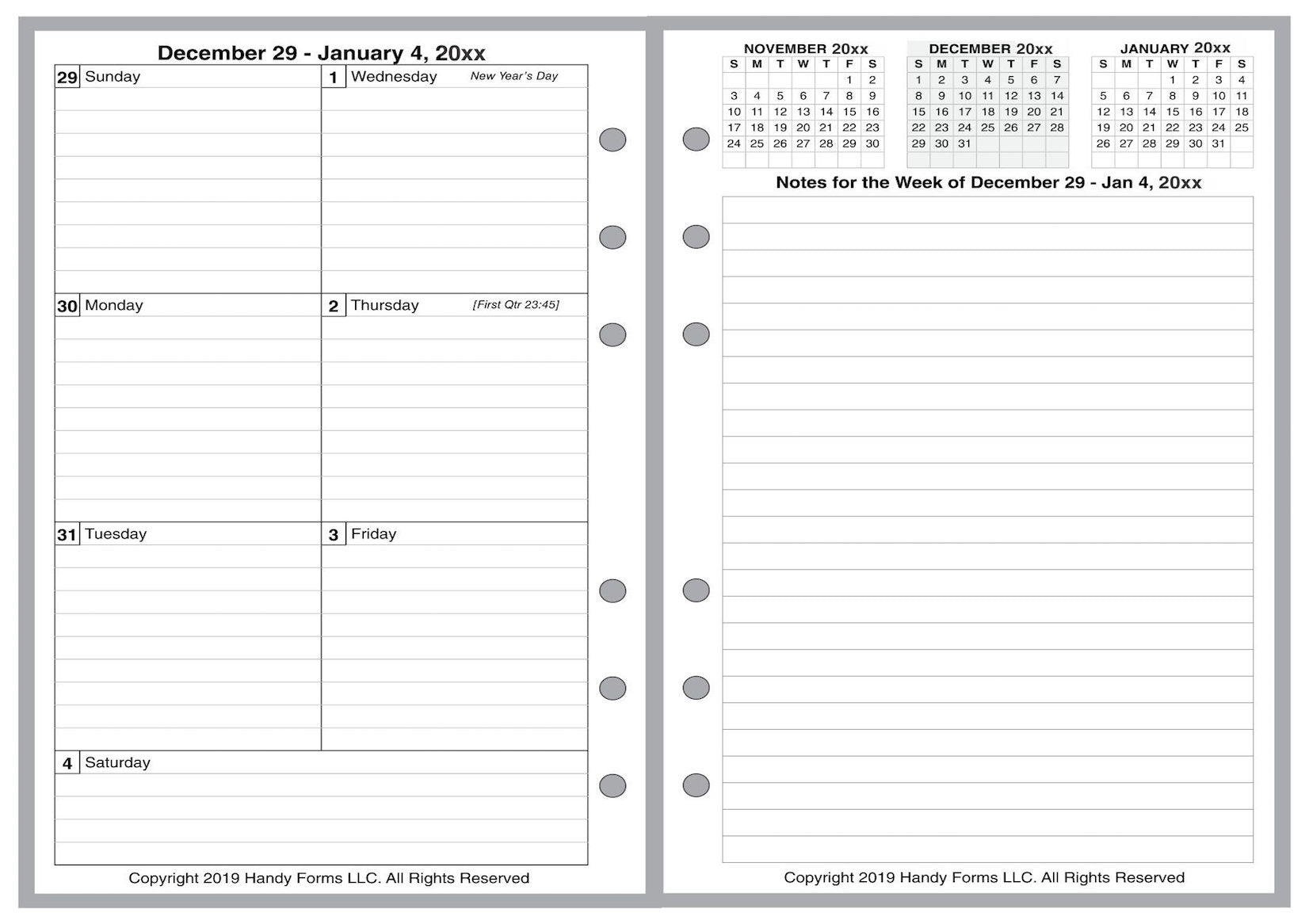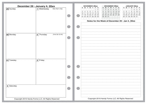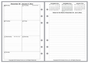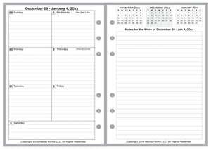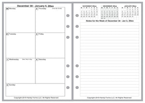 This is a weekly & monthly planner insert for the Personal Wide notebook. Page is Personal Wide size, 4-3/4in x 6-3/4in. Choose the week start day as Sunday or Monday. Each week is a 2-page spread. The days of the week are on the left. The first 6 days of the week are arranged in 2 columns, 3 days on the left and 3 on the right. The 7th day spans across the bottom. On the right is a note page which includes mini-reference monthly calendars showing the previous, current, and following months.