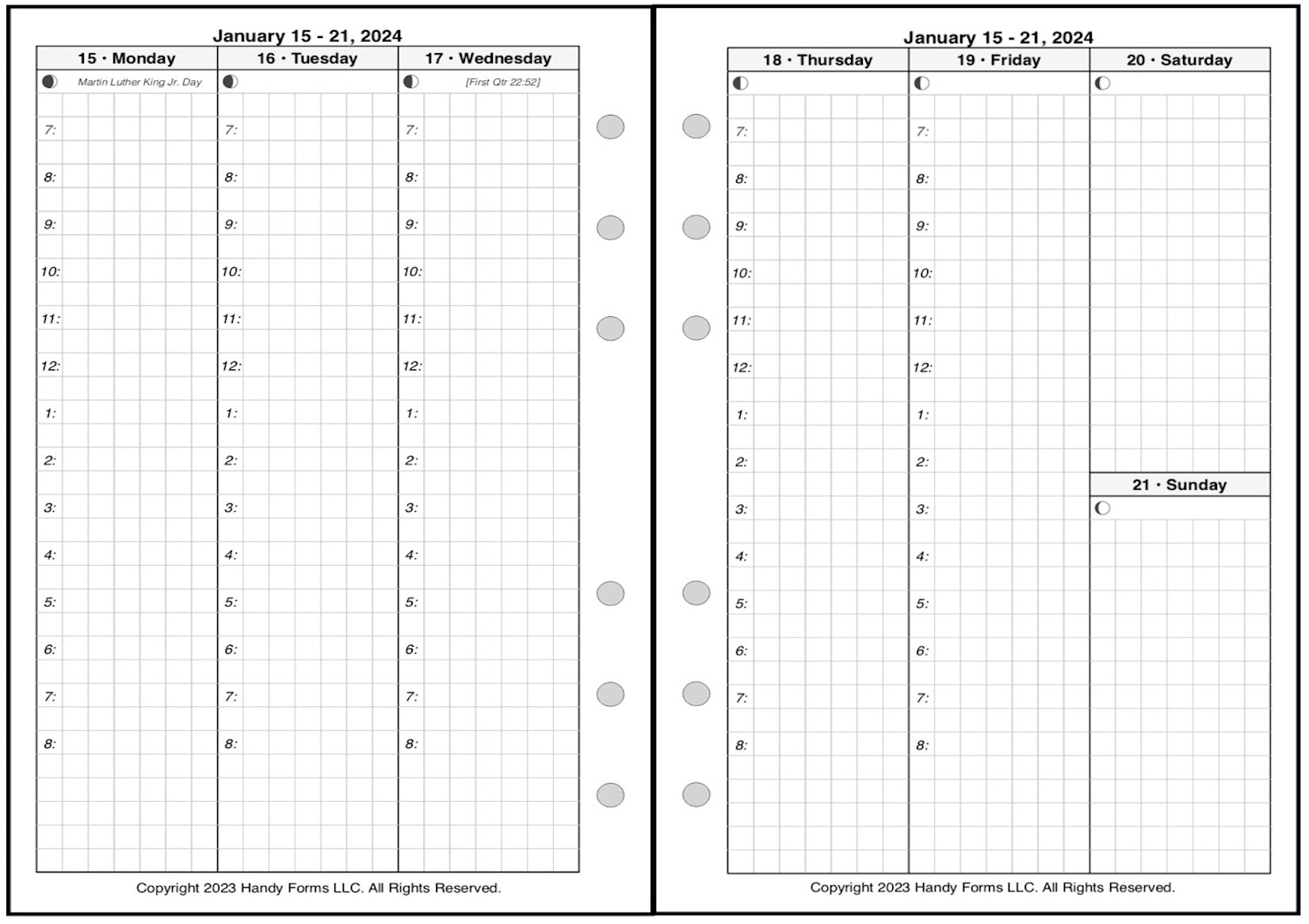 This is a weekly & monthly planner insert for the Personal Wide notebook. Page is Personal Wide size, 4-3/4in x 6-3/4in. The week starts on Monday. Each day of the week is a vertical column. The first 3 days of the week are on the left, and the last 4 are on the right, with Saturday and Sunday sharing the right-hand column. Time slots are printed for 7:00 AM through 7:00 PM on each weekday. There is a mini reference calendar for the current month at the bottom of the right-most column.
