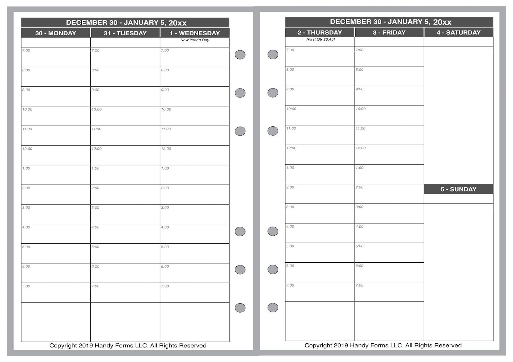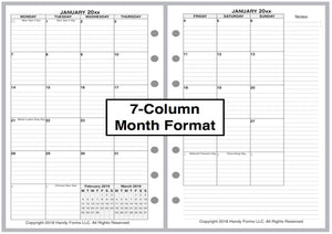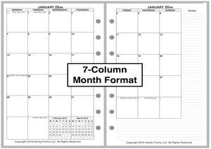 If selected, the monthly spreads are merged with the weekly pages so that the month appears immediately before the weekly pages where the first day of that month occurs. A durable plastic tab is attached to the weekly page just before the month. The monthly pages are available in 3 different formats called 6-column, 7-column, and 8-column. Please see the images for examples.