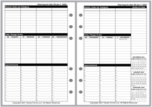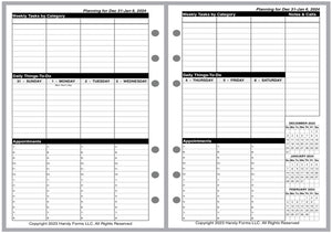 This is a weekly & monthly planner insert for the Personal Wide notebook. Page is Personal Wide size, 4-3/4in x 6-3/4in. Choose the week start day as Sunday or Monday. Each week is a 2-page spread. The first 4 days of the week are on the left, and the remaining days are on the right. The top section of the page is a general area for weekly task planning. Below this planning section is space for daily to-do items. The bottom section is divided into daily appointment slots from 7 AM to 8 PM. On the right-hand page is a column for "Notes & Calls" plus 3 mini reference calendars showing the current month, plus the 2 following months.