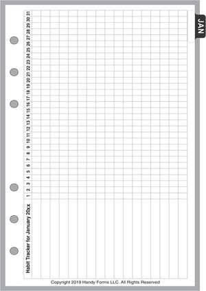 This is a monthly planner and habit tracker insert for the Personal Wide notebook. Page is Personal Wide size, 4-3/4in x 6-3/4in. The week starts with Sunday or Monday. Each month is a 4 pages. The first page is the habit list and daily tracking for the month. Following this page is the 2-page calendar spread for the month with days arranged according to the monthly style (see below). The 4th page is labeled "Month Review and Habit Notes". For 6-column and 8-column styles, if the 30th and/or the 31st would fall below the bottom row of the monthly spread, these dates are moved to the first 2 daily blocks in the first row. Lines are printed in the daily blocks.
