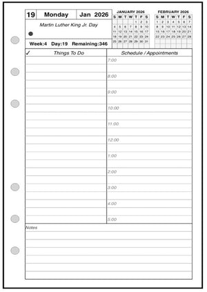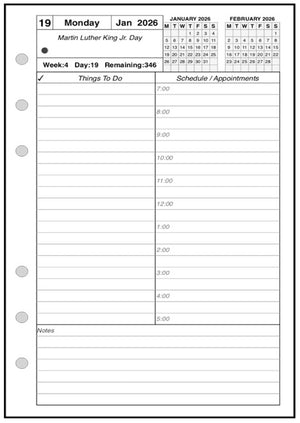 This is a daily and monthly planner insert for the Personal Wide notebook. Page is Personal Wide size, 4-3/4in x 6-3/4in. Choose the week starting day as Sunday or Monday. Each day is on one page, and months are 2-page spreads. Each daily page has appointment slots from 7:00 am to 8:00 pm. In addition there is a column for daily activities and a checklist for things to do. Included are mini calendars for the current and next months.