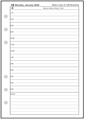 This is a daily and monthly planner insert for the Personal Wide notebook. Page is Personal Wide size, 4-3/4in x 6-3/4in. The week starts on Sunday or Monday. Each day is on one page. The page provides appointment time slots from 6:00 am to 7:00 pm plus space for general notes. Also included are 1-page yearly calendars for the current year and next year.