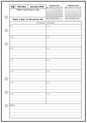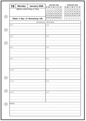 This is a daily and monthly planner insert for the Personal Wide notebook. Page is Personal Wide size, 4-3/4in x 6-3/4in. Choose the week starting day as Sunday or Monday. Each day is on one page. The hourly appointment blocks are arranged vertically in 2 columns with times from 6:00 am through 7:00 pm. The appointment time range can be changed through customization.