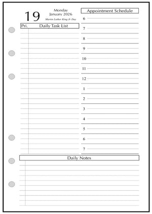 This is a daily and monthly planner insert for the Personal Wide notebook. Page is Personal Wide size, 4-3/4in x 6-3/4in. Choose the week starting day as Sunday or Monday. Each day is on one page. There is a checkmarked section for Daily Tasks, appointment times from 6:00 am to 7:00 pm, and a block for notes.