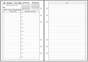 This is a daily and monthly planner insert for the Personal Wide notebook. Page is Personal Wide size, 4-3/4in x 6-3/4in. Choose the week starting day as Sunday or Monday. Each day is on two pages, and months are 2-page spreads. Each daily page has appointment slots from 7:00 am to 8:00 pm. In addition there is a column for activities/schedule, and a checklist for things to do. Included are mini calendars for the current and next months.