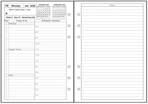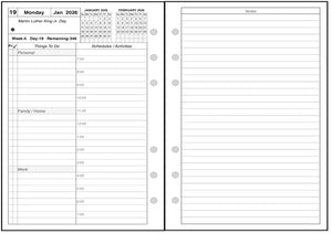 This is a daily and monthly planner insert for the Personal Wide notebook. Page is Personal Wide size, 4-3/4in x 6-3/4in. Choose the week starting day as Sunday or Monday. Each day is on two pages, and months are 2-page spreads. Each daily page has appointment slots from 7:00 am to 8:00 pm. In addition there is a column for daily schedule/activities and a checklist for things to do. The daily activity section is divided into 3 subsections labeled Personal, Family / Home, and Work. The subsection names can be changed through customization. Included are mini calendars for the current and next months.