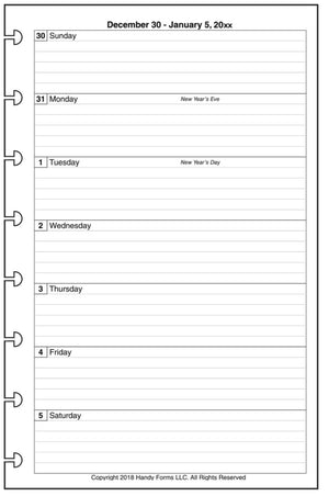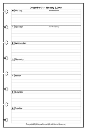 This is a weekly and monthly planner insert for Levenger/Staples Junior size disc bound notebooks. Page is Levenger Junior (half-letter) size, 5-1/2in x 8-1/2in. Choose the week start day as Sunday or Monday. Each week is on one page, and months are 2-page spreads. The weekly pages have separate blocks for each day.