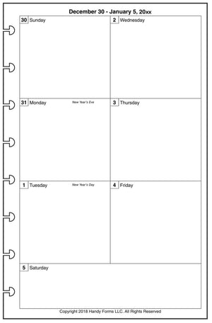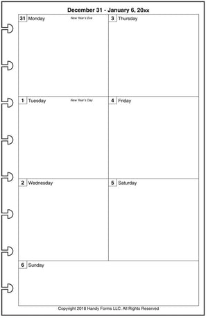 This is a weekly and monthly planner insert for Levenger/Staples Junior size disc bound notebooks. Page is Levenger Junior (half-letter) size, 5-1/2in x 8-1/2in. Choose the week start day as Sunday or Monday. Each week is on one page. The daily blocks are arranged vertically with the first 3 days of the week on the left, the next 3 on the right, with the last day across the bottom.