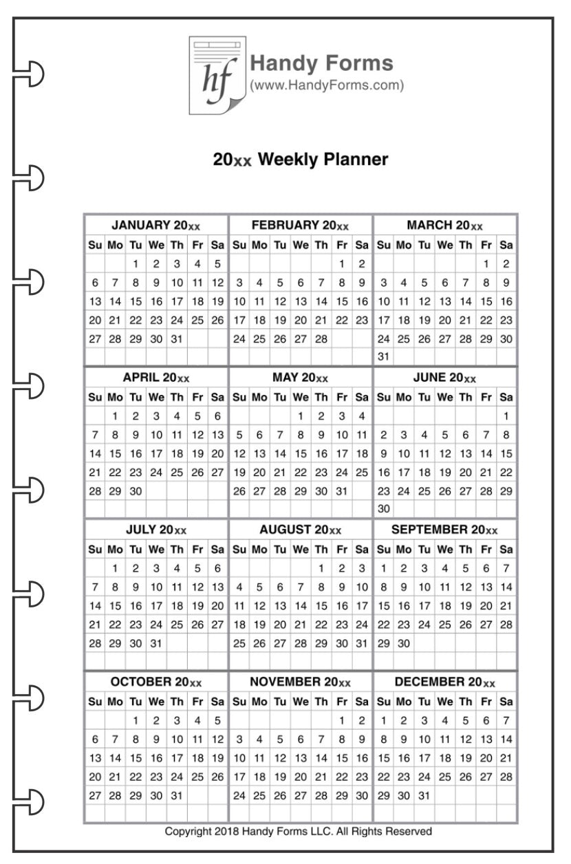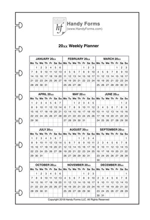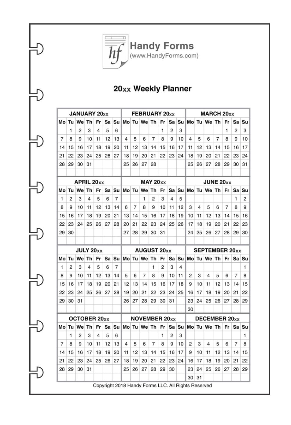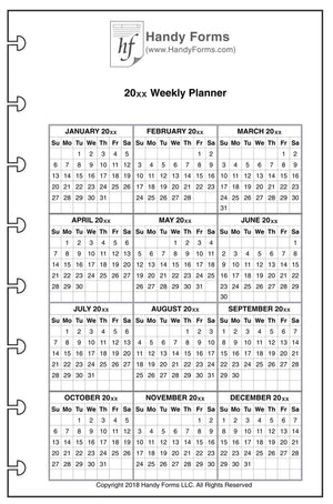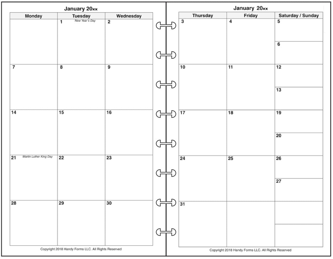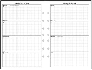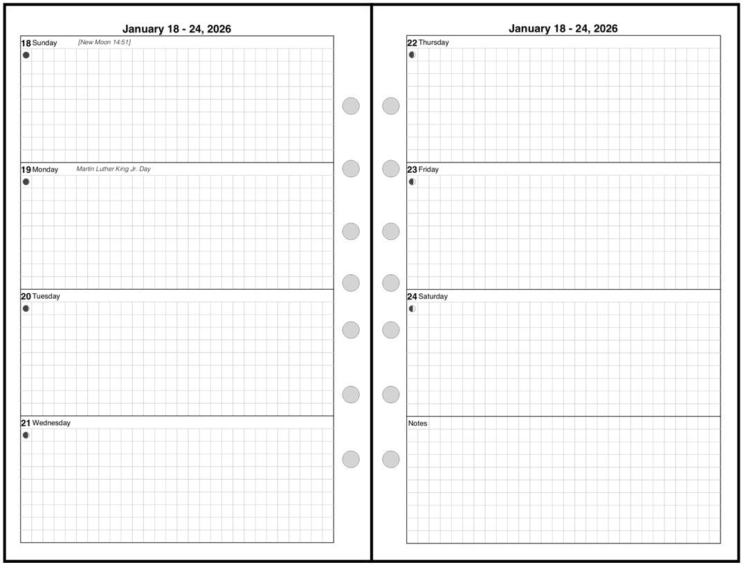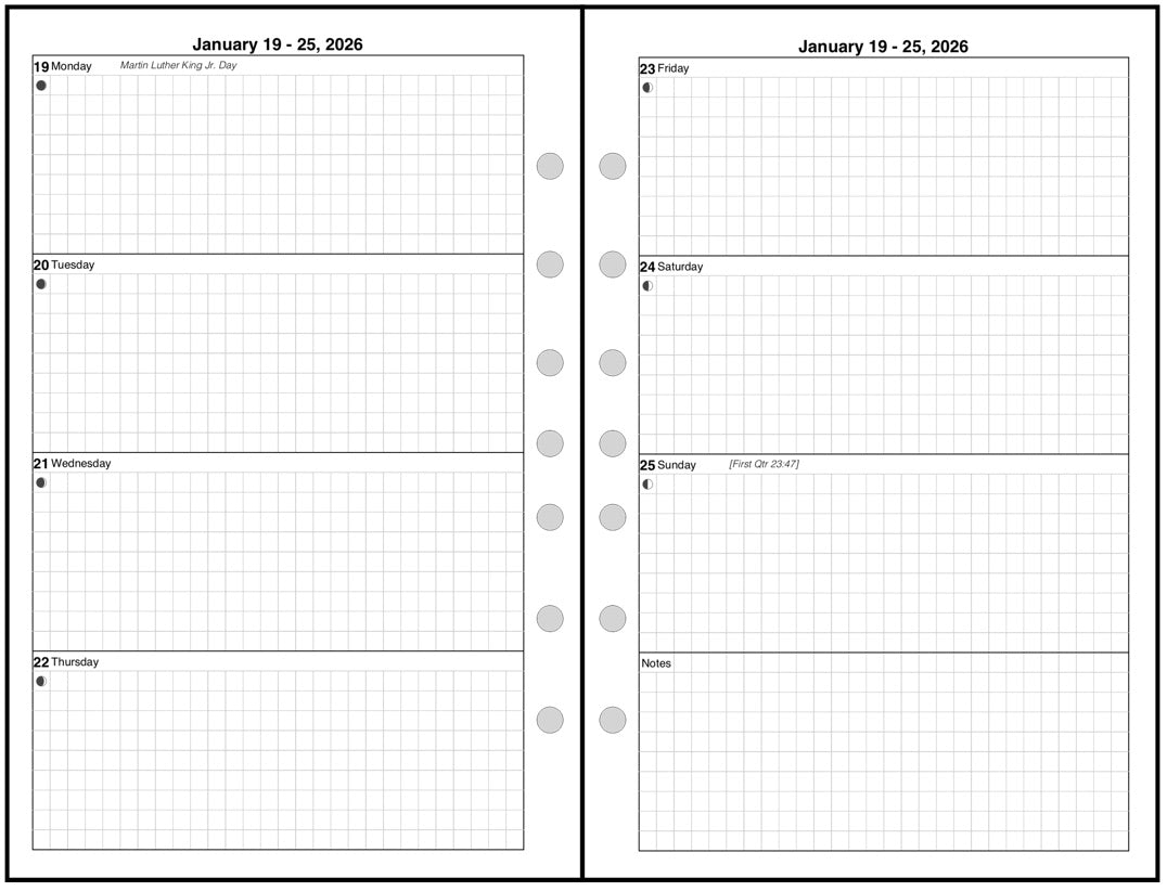 This is a weekly & monthly planner insert for Levenger/Staples Junior size disc bound notebooks.. Page is Levenger Junior (half-letter) size, 5-1/2in x 8-1/2in. Each week is on 2 pages. Choose the week start day as Sunday or Monday. The first 4 days of the week are on the left, and the last 3 are on the right, plus space for notes and a mini reference calendar of the current month.