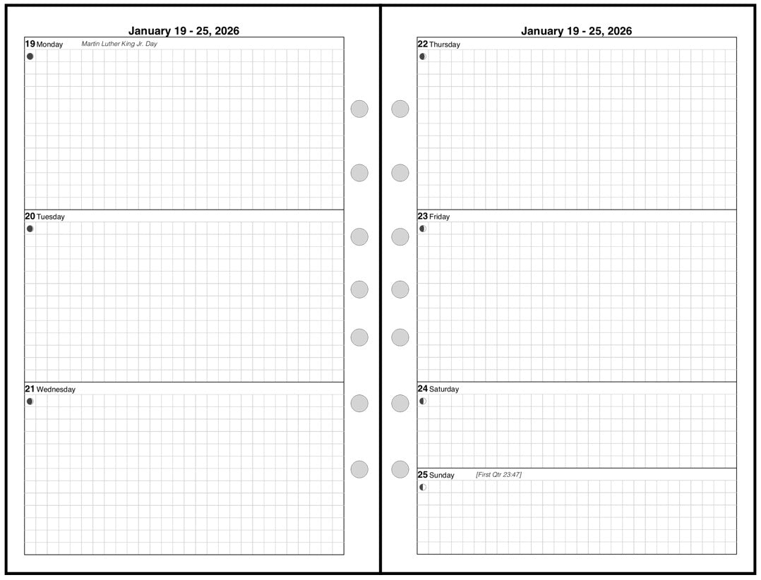 This is a weekly & monthly planner insert for Levenger/Staples Junior size disc bound notebooks.. Page is Levenger Junior (half-letter) size, 5-1/2in x 8-1/2in. The week starts on Monday. Each week is on one page. The 2 page weekly spread provides large blocks for Monday through Friday, and half size blocks for Saturday and Sunday.