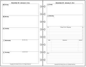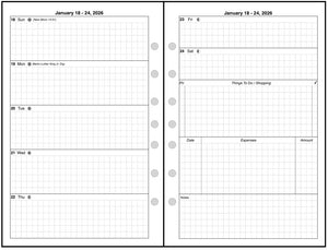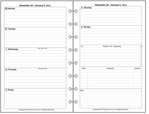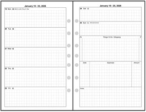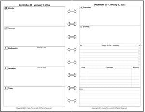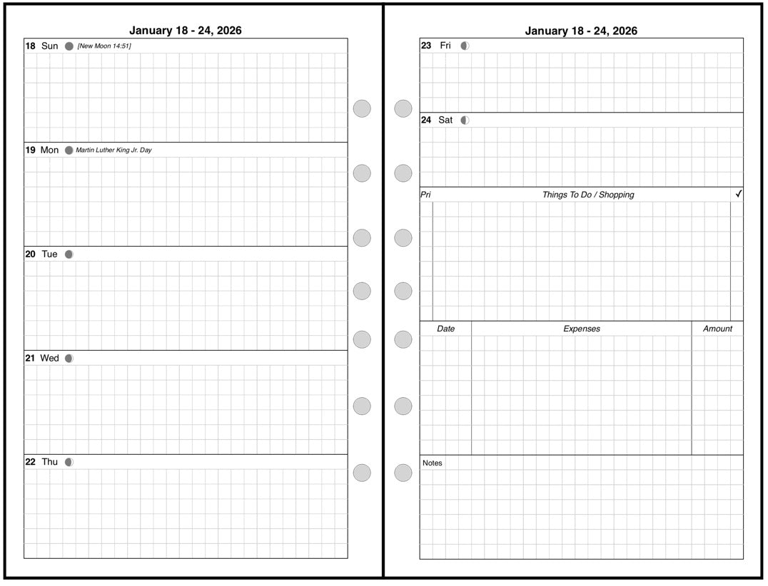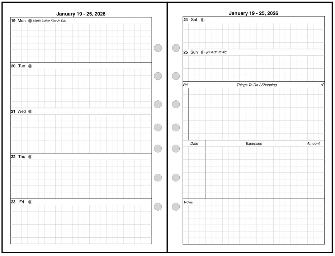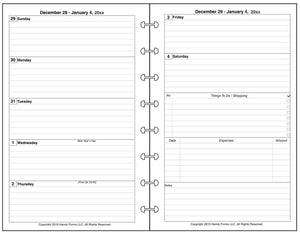 This is a weekly & monthly planner insert for Levenger/Staples Junior size disc bound notebooks.. Page is Levenger Junior (half-letter) size, 5-1/2in x 8-1/2in. Choose the week start day as Sunday or Monday. Each week is a 2-page spread. The first 5 days of the week on the left, the last 2 on the right. On the right there are sections for a weekly To-Do list, an expense record, and notes.