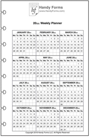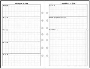 This is a weekly & monthly planner insert for Levenger/Staples Junior size disc bound notebooks.. Page is Levenger Junior (half-letter) size, 5-1/2in x 8-1/2in. Choose the week start day as Sunday or Monday. Each week is a 2-page spread. The first 5 days of the week on the left, the last 2 on the right. On the right there is also a large section for a weekly To-Do list.