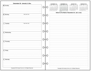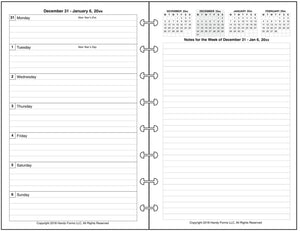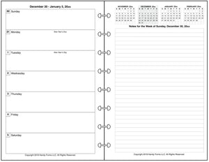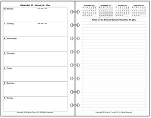 This is a weekly & monthly planner insert for Levenger/Staples Junior size disc bound notebooks.. Page is Levenger Junior (half-letter) size, 5-1/2in x 8-1/2in. Choose the week start day as Sunday or Monday. Each week is a 2-page spread. The days of the week are on the left. On the right is a note page which includes mini-reference monthly calendars showing the previous, current, and following months.