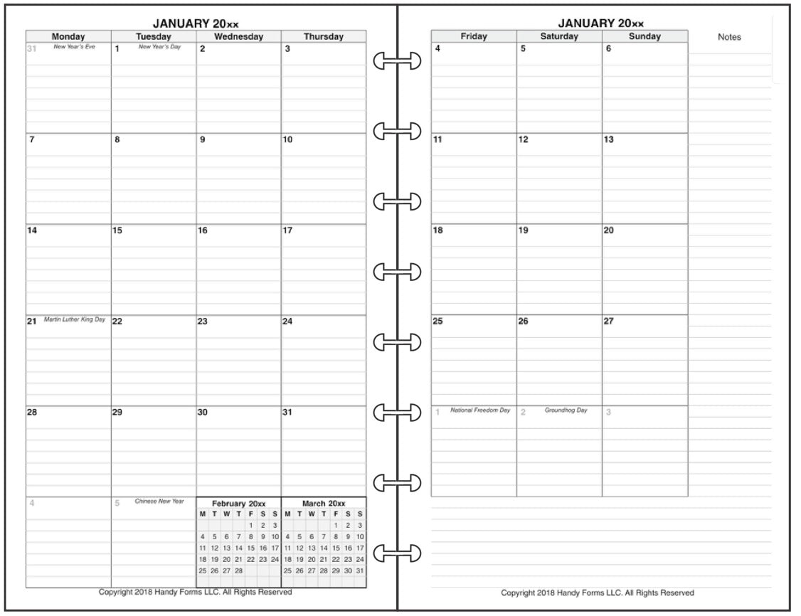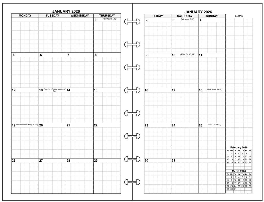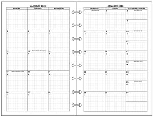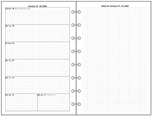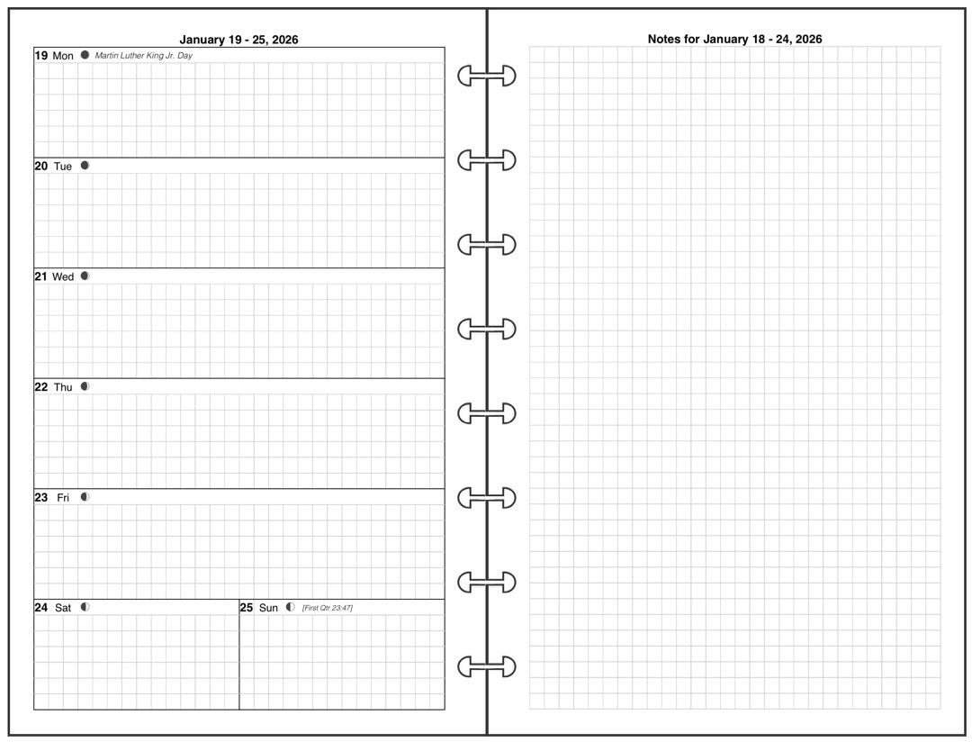 This is a weekly & monthly planner insert for Levenger/Staples Junior size disc bound notebooks.. Page is Levenger Junior (half-letter) size, 5-1/2in x 8-1/2in. The week starts with Monday. Each week is a 2-page spread. The days of the week are on the left. Monday through Friday are full width blocks, with Saturday and Sunday half-size at the bottom. On the right is a page for notes.