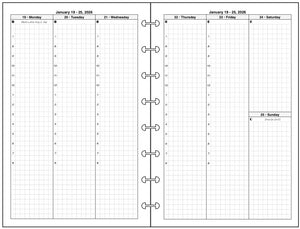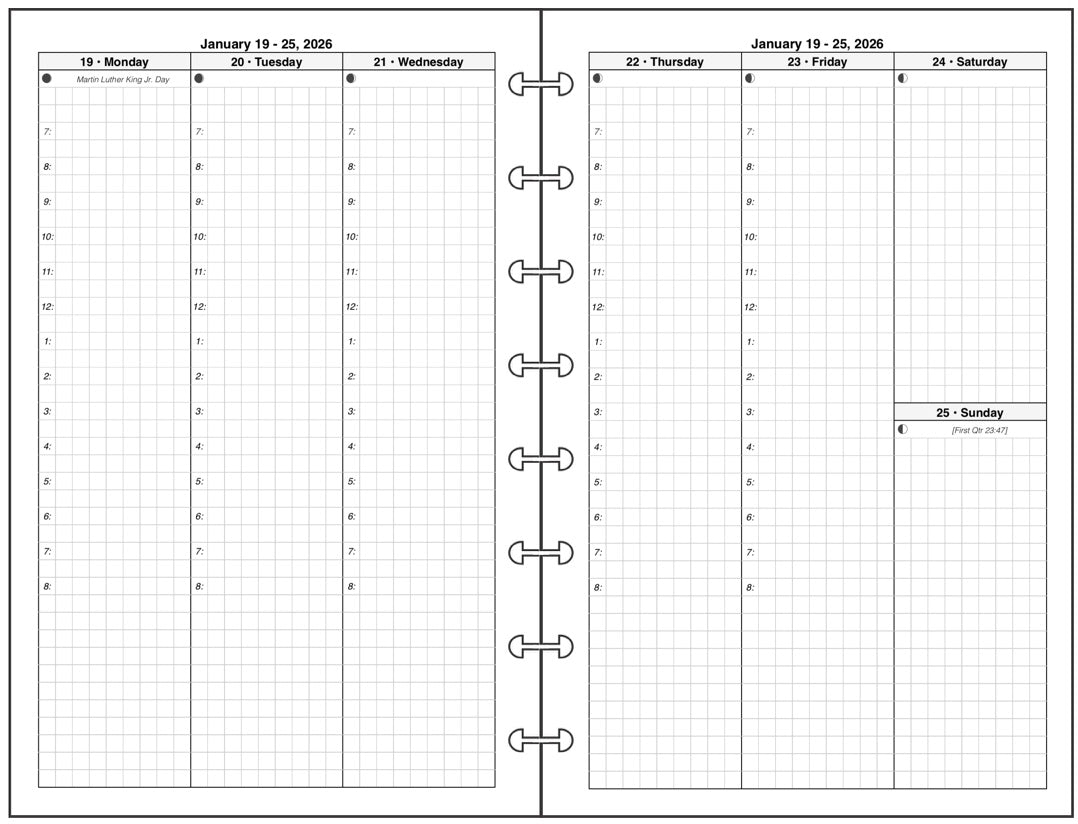 This is a weekly & monthly planner insert for Levenger/Staples Junior size disc bound notebooks.. Page is Levenger Junior (half-letter) size, 5-1/2in x 8-1/2in. The week starts on Monday. Each day of the week is a vertical column. The first 3 days of the week are on the left, and the last 4 are on the right, with Saturday and Sunday sharing the right-hand column. Time slots are printed for 7:00 AM through 7:00 PM on each weekday. There is a mini reference calendar for the current month at the bottom of the right-most column.