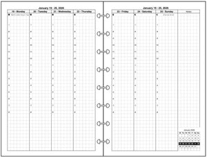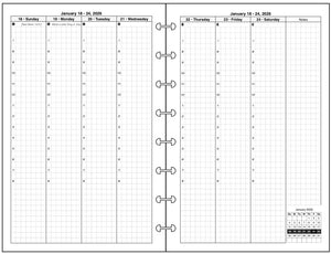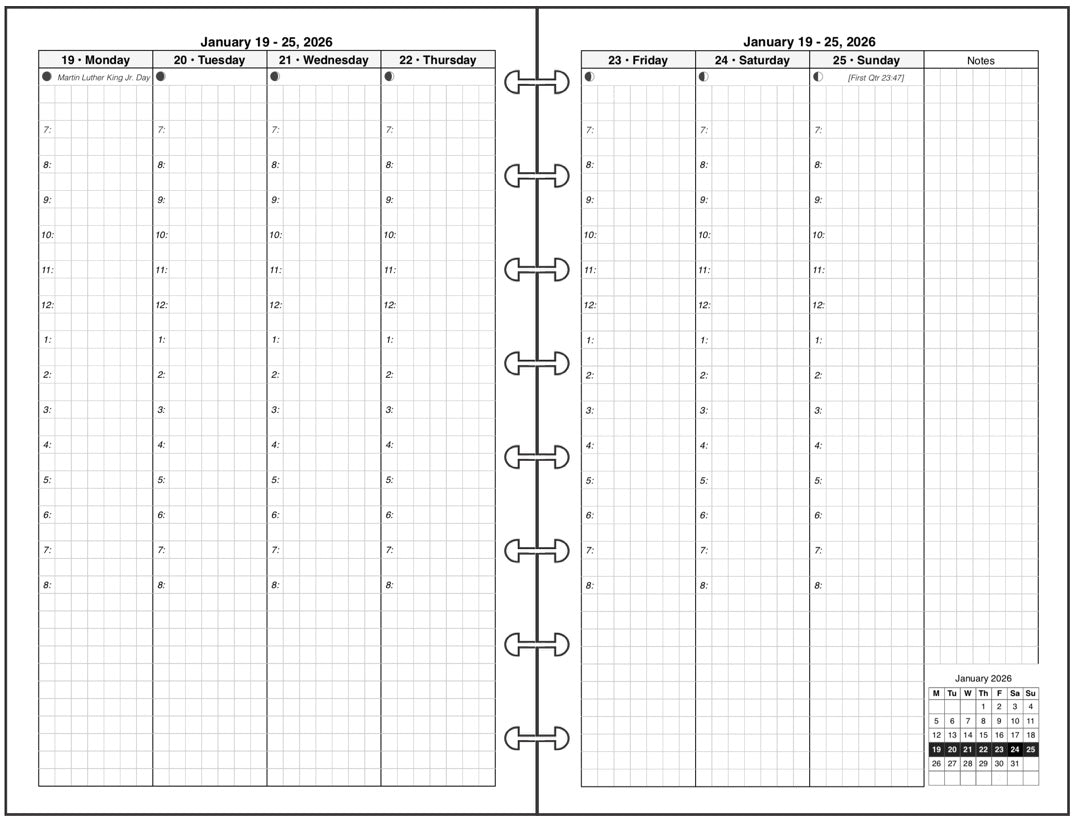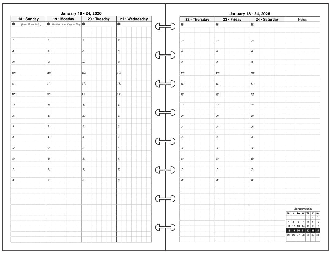 This is a weekly & monthly planner insert for Levenger/Staples Junior size disc bound notebooks.. Page is Levenger Junior (half-letter) size, 5-1/2in x 8-1/2in. Choose the week start day as Sunday or Monday. Each day of the week is a vertical column. The first 4 days of the week are on the left, and the last 3 are on the right. The right-hand column is lined for notes. Time slots are printed for 7:00 AM through 7:00 PM on each day. There is a mini reference calendar for the current month at the bottom of the notes column.
