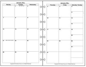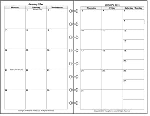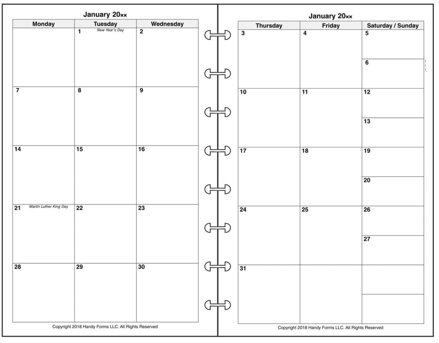 This is a monthly planner insert for the popular Junior Size Disc Binding notebooks. Page is Junior size (Half-Letter), 5½" x 8½" (140mm x 216mm). The week starts with Monday. Each month is a 2-page spread. Monday-Tuesday-Wednesday are on the left-hand page, and Thursday-Friday-Saturday/Sunday are on the right. Saturday and Sunday share the right-hand column. The daily blocks do not have lines. This is a 5 week monthly layout, so occasionally the 30th and/or the 31st would fall below the bottom row. When this happens, these dates can be either moved to the first 2 daily blocks in the first row, or these overflow days can be printed in the Monday-Tuesday blocks in the 5th week.