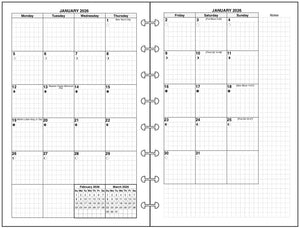 This is a monthly planner insert for Junior Size Disc Binding notebooks. Page is Junior size (Half-Letter), 5½" x 8½" (140mm x 216mm). The week start is optionally Sunday or Monday. Each month is a 2-page spread. The first 4 days of the week are on the left-hand page, and the last 3 days are on the right, plus an area for notes. A grid is printed in the daily blocks.