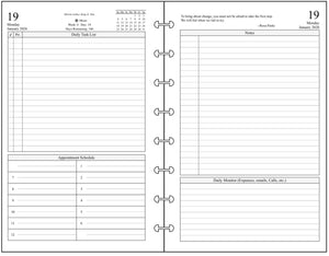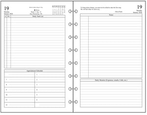 This is a daily and monthly planner insert for Levenger/Staples Junior size disc bound notebooks. Page is Levenger Junior (half-letter) size, 5-1/2in x 8-1/2in. Choose the week starting day as Sunday or Monday. Each day is on two pages. There is a checkmarked section for Daily Tasks with priorities, appointment times from 7:00 am to 6:00 pm, and a block for notes, and a Daily Monitor for tracking such things as expenses and messages. This planner style also includes optional, randomly selected, motivational messages.