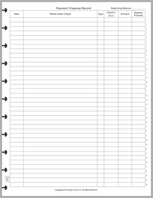 • Record date, payee, type of payment (check, credit card, debit card, cash), check#/credit card #, amount paid, balance forward, and additional information
