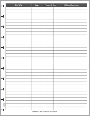 Login/Password reference pages for Levenger Letter size notebooks. Includes instructions to encrypt your passwords when writing them down.