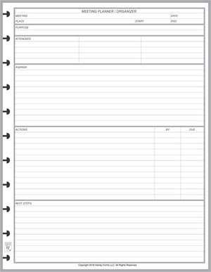 This is a helpful Meeting Planner and Organizer for Levenger Letter size notebooks. This handy form is ideal to help organize and document meetings. Included are spaces for date, time, and location of the meeting, the attendees, the meeting agenda, actions and follow-up including who is responsible. The reverse side of the form is for discussion notes.