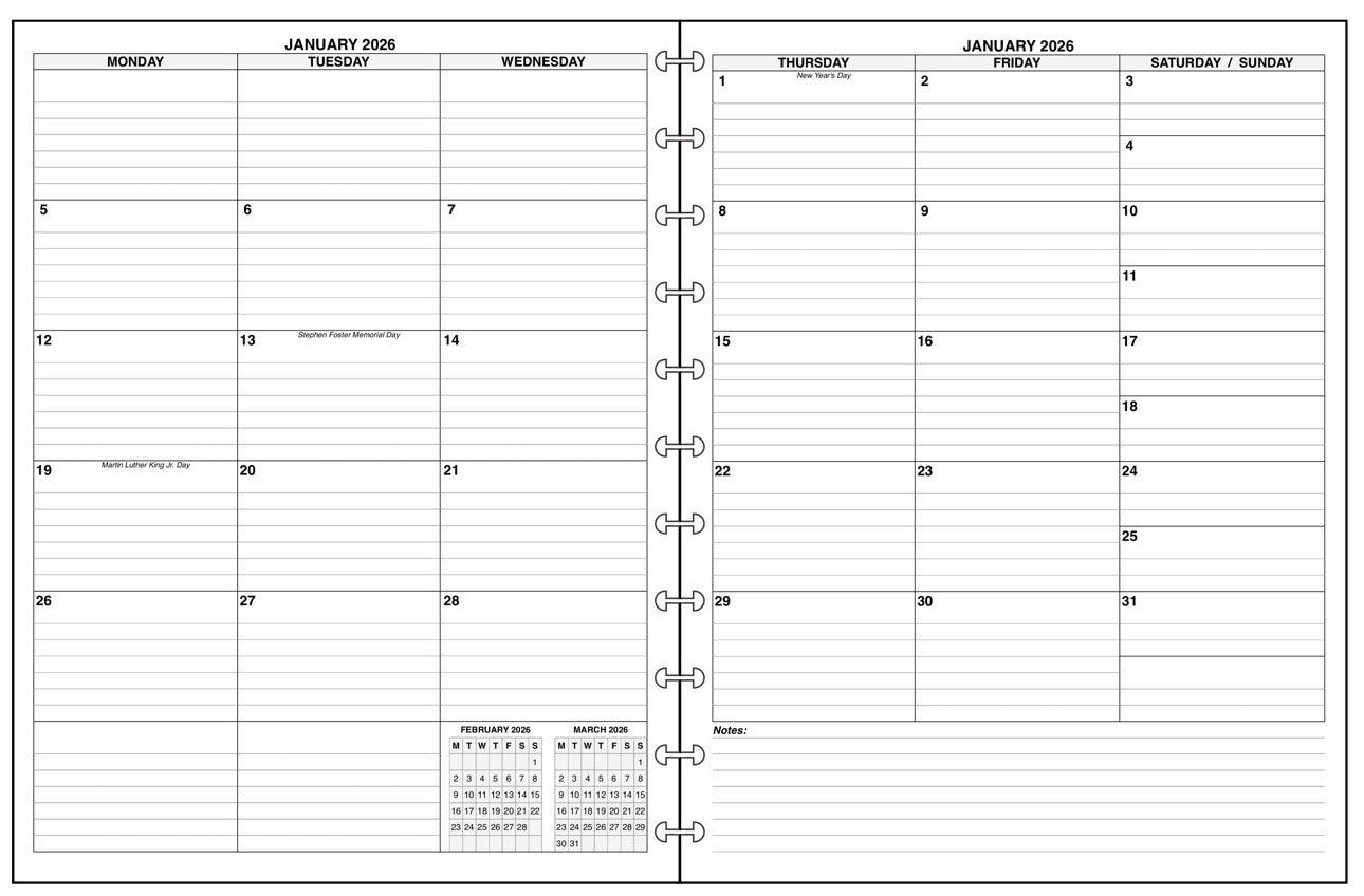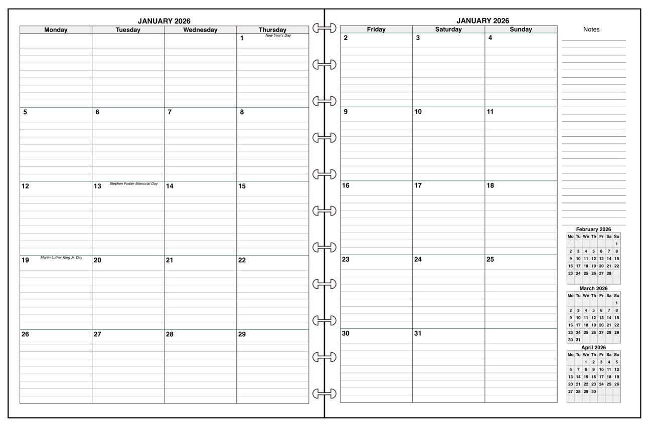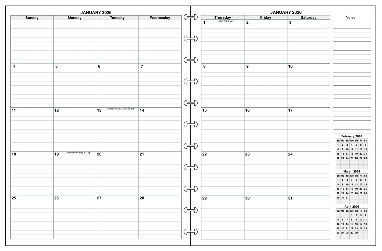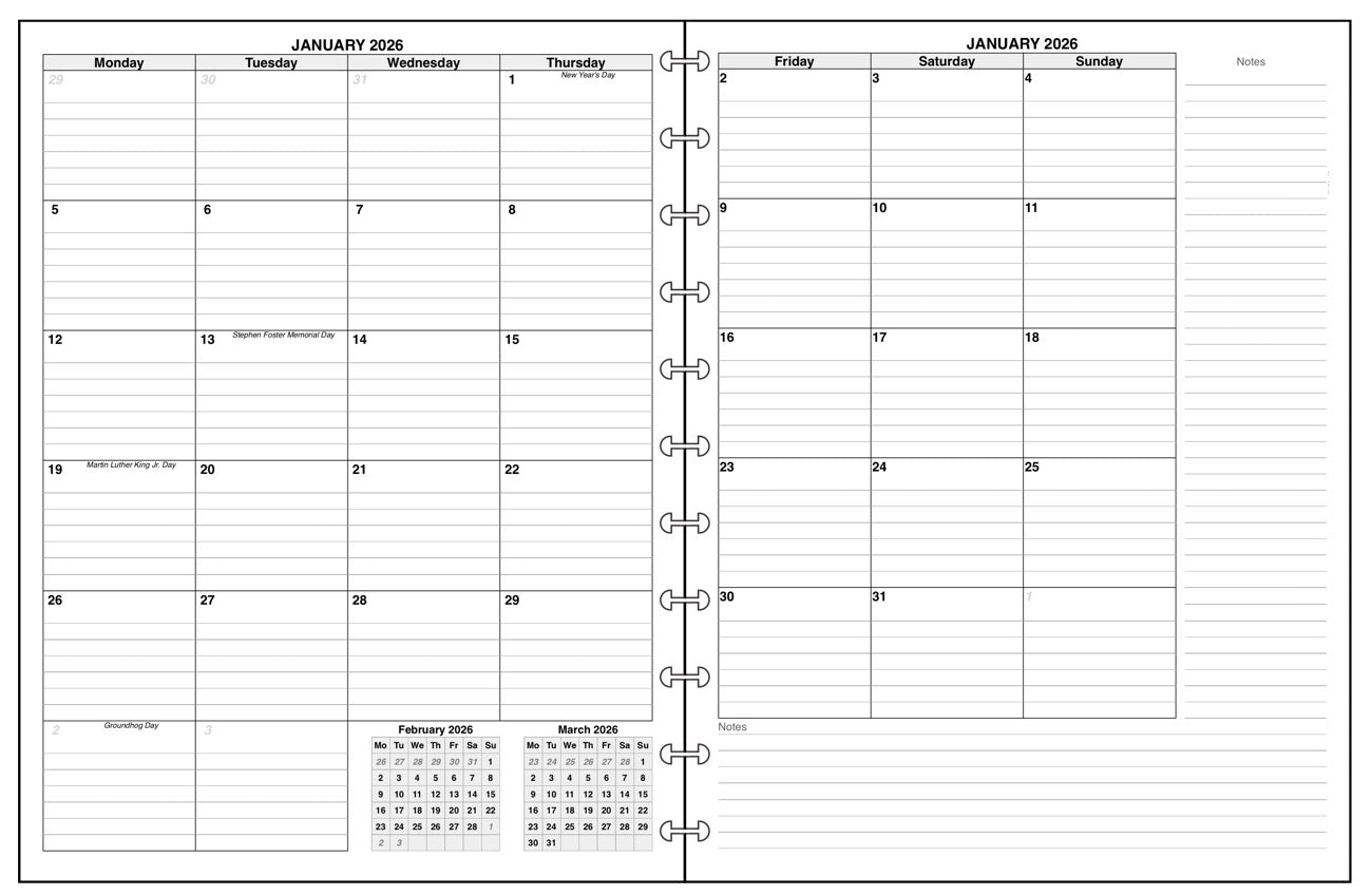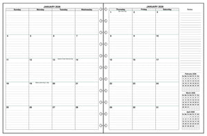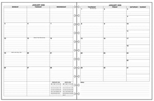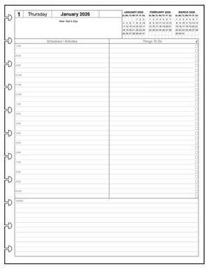 This is a daily and monthly planner insert for the popular Levenger/Staples Letter size size notebooks. Page size is Letter standard 8½" x 11" (216mm x 280mm). Choose the week starting day as Sunday or Monday. Each day is on one page, and months are 2-page spreads. Each daily page has appointment slots from 7:00 am to 10:00 pm. In addition there is a column for daily activities and a checklist for things to do. Included are mini calendars for the current and next months.