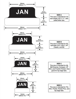 High quality adhesive monthly tabs. These are our regular sturdy plastic tabs, which we apply by hand to our monthly products. This item includes two or four complete sets of JAN through DEC tabs plus instructions. A template is included to properly space the tabs on various size pages.