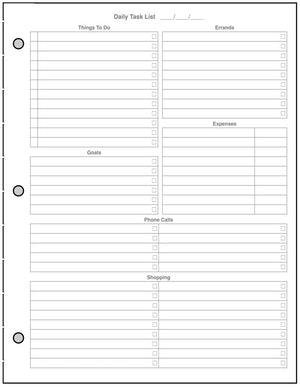 • Daily Task Planner for the US Letter 3-Ring notebook, including to-do list, errands, phone calls, shopping and expenses.