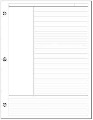 Notes pages for your US Letter 3-Ring organizer, specially designed for the Cornell notes system. This system provides an effective technique to record class notes, meeting notes, and any general record keeping requirement. The top line is for the subject title and date. The right-hand panel is for detailed notes. The left-hand panel is for cues that reference the detailed notes. The bottom panel is for a summary of the details. You can find a lot more about this system online.