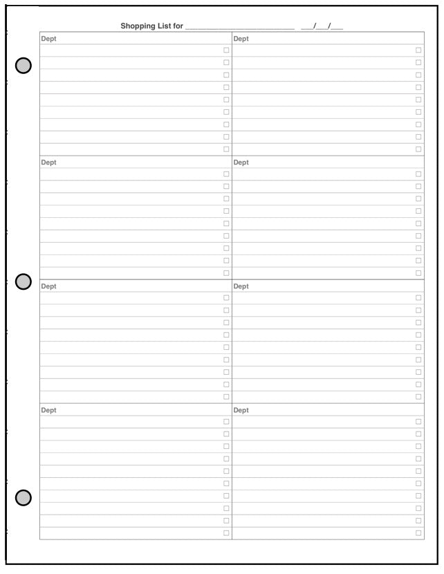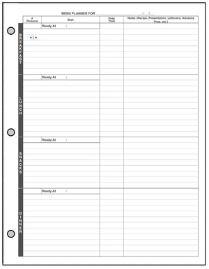 Planning meals, especially for a busy family with entertainment, school functions, work commitments, and community activities can be very challenging. What are we having for dinner next Thursday? What do I have to shop for? How many people will be at the table? This handy form for your US Letter 3-Ring planner can help. It combines 3 different forms: (1) a weekly meal planner for each day, including breakfast, lunch, snacks (or hors d'oeurves), and dinner; (2) a daily meal planner for breakfast, lunch, snacks, and dinner, including the number of people, the time it has to be ready, each dish planned, the preparation time, plus special notes about the recipe, presentation, left overs, advanced prep, etc.; and (3) a shopping list form separating items by store, date, and department, providing a check-off for items purchased.